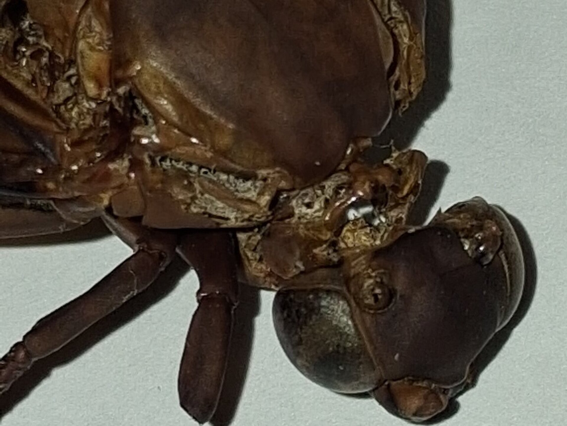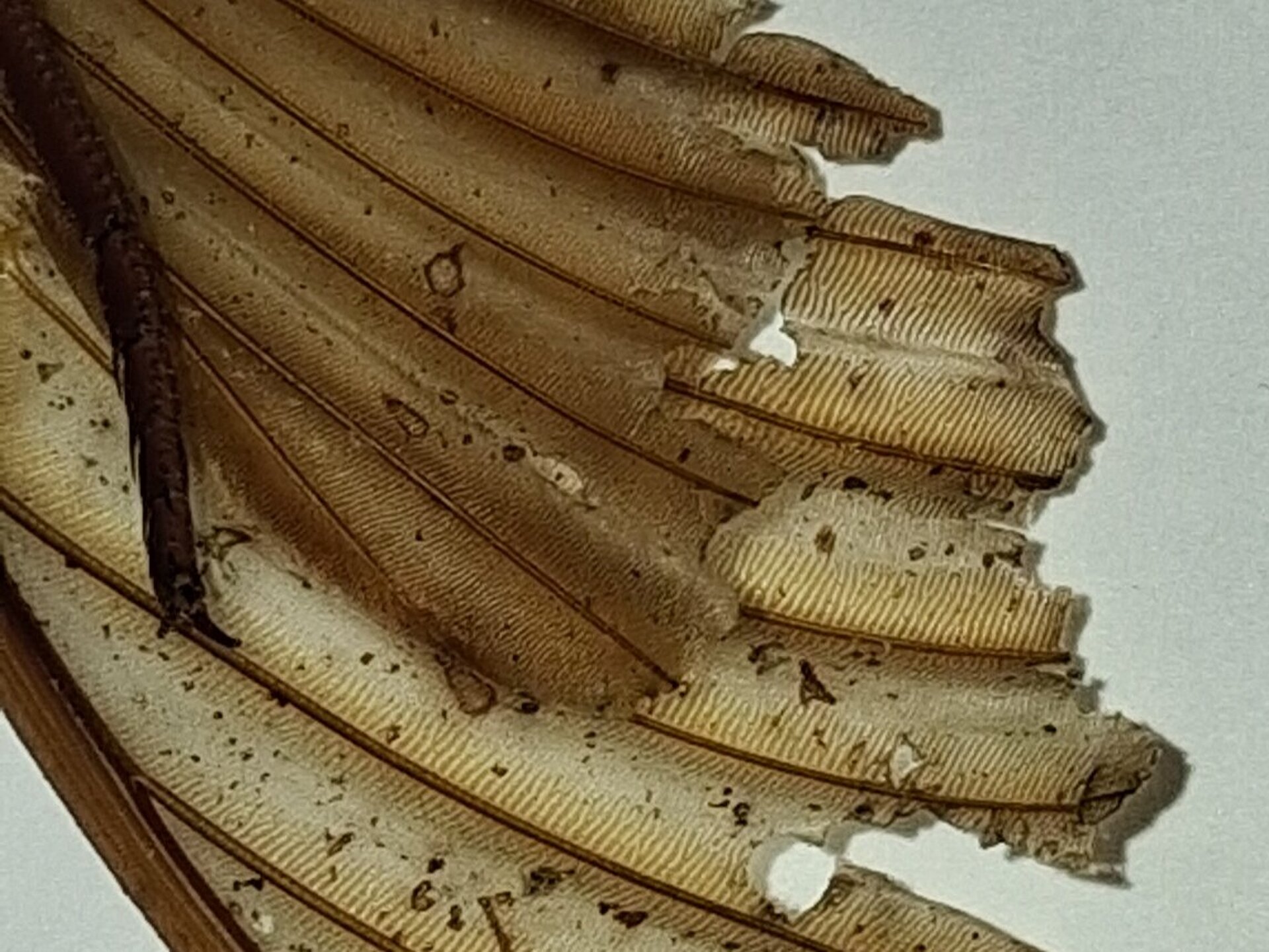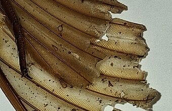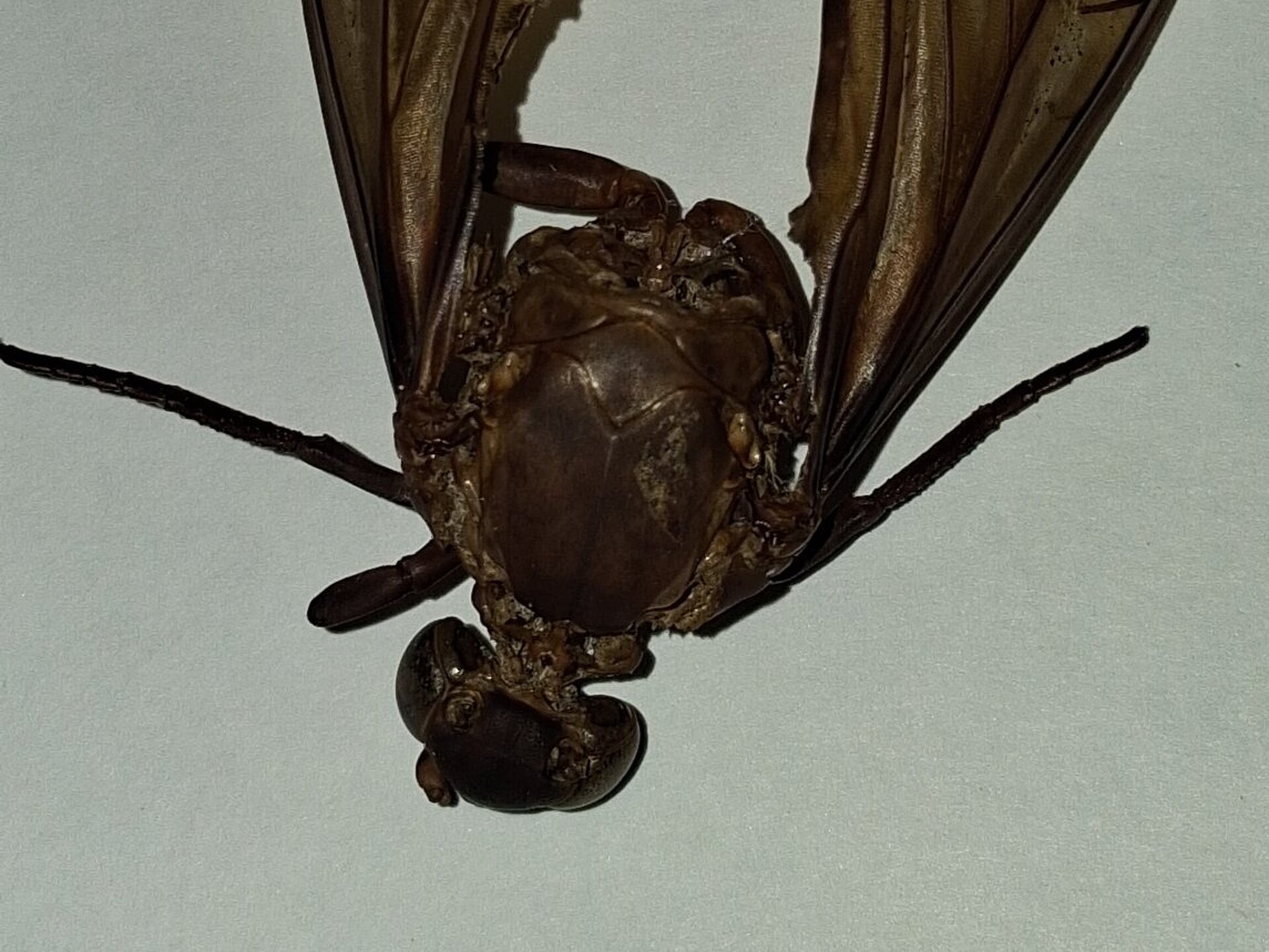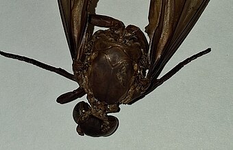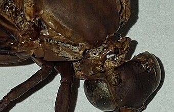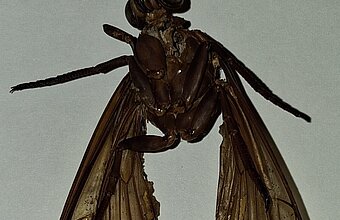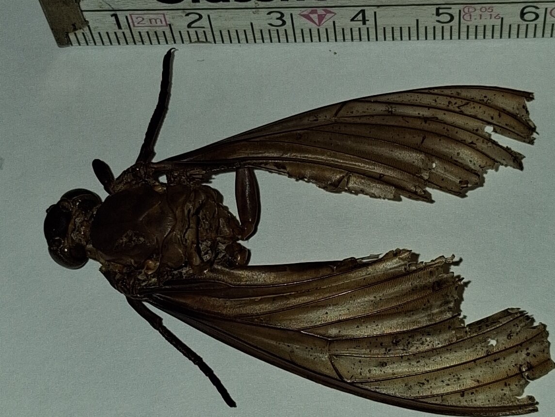 Diesmal war es keine Spitzmaus-Mumie, sondern ein riesenhaftes Insekt, das aber nur noch als Restleiche vorhanden war. Der komplette Hinterleib war weg, die Körperbehaarung war weg, so dass die Identifizierung auf den ersten Blick gar nicht so einfach war. Der Torso war vom Kopf bis zu den Flügelenden stattliche 6 cm lang, das Insekt hatte vier leicht abgespreizte Flügel, einen bulligen Kopf und Thorax, erwartungsgemäß 6 Beine und ein auffällig kräftiges und geradliniges Adergerüst in den Flügeln.